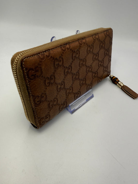 Gucci Guccissima Brown Leather Zippy Wallet with Bamboo And Box