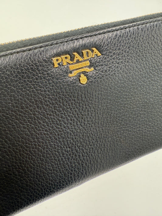 Prada Black Pebbled Leather Long Zippy Wallet