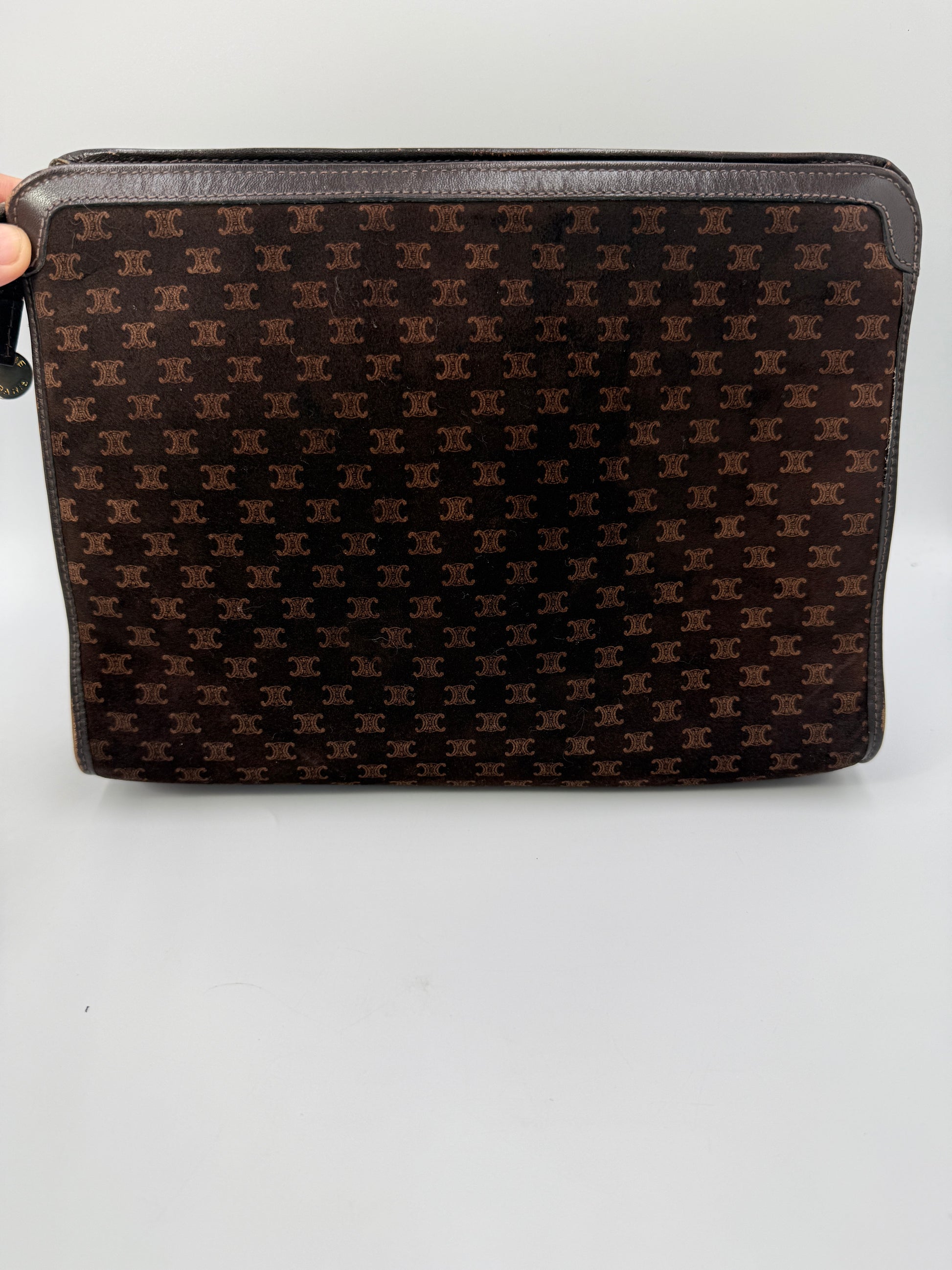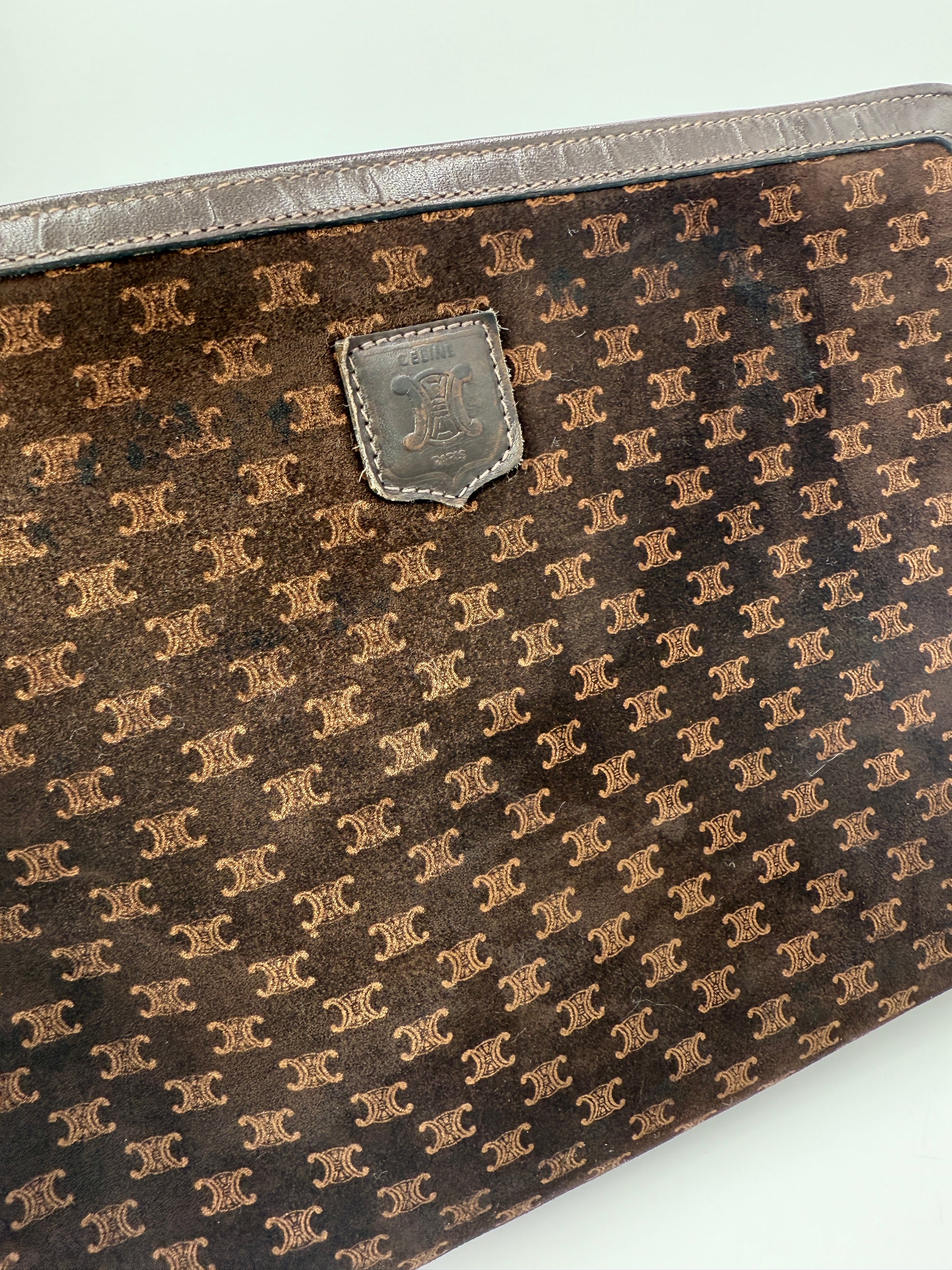 Indulge in timeless Parisian elegance with this authentic vintage Celine suede clutch, a luxurious and refined piece that captures the essence of classic Celine design. The soft suede exterior is embossed throughout with the iconic Triomphe logo, offering subtle sophistication and unmistakable brand heritage.
