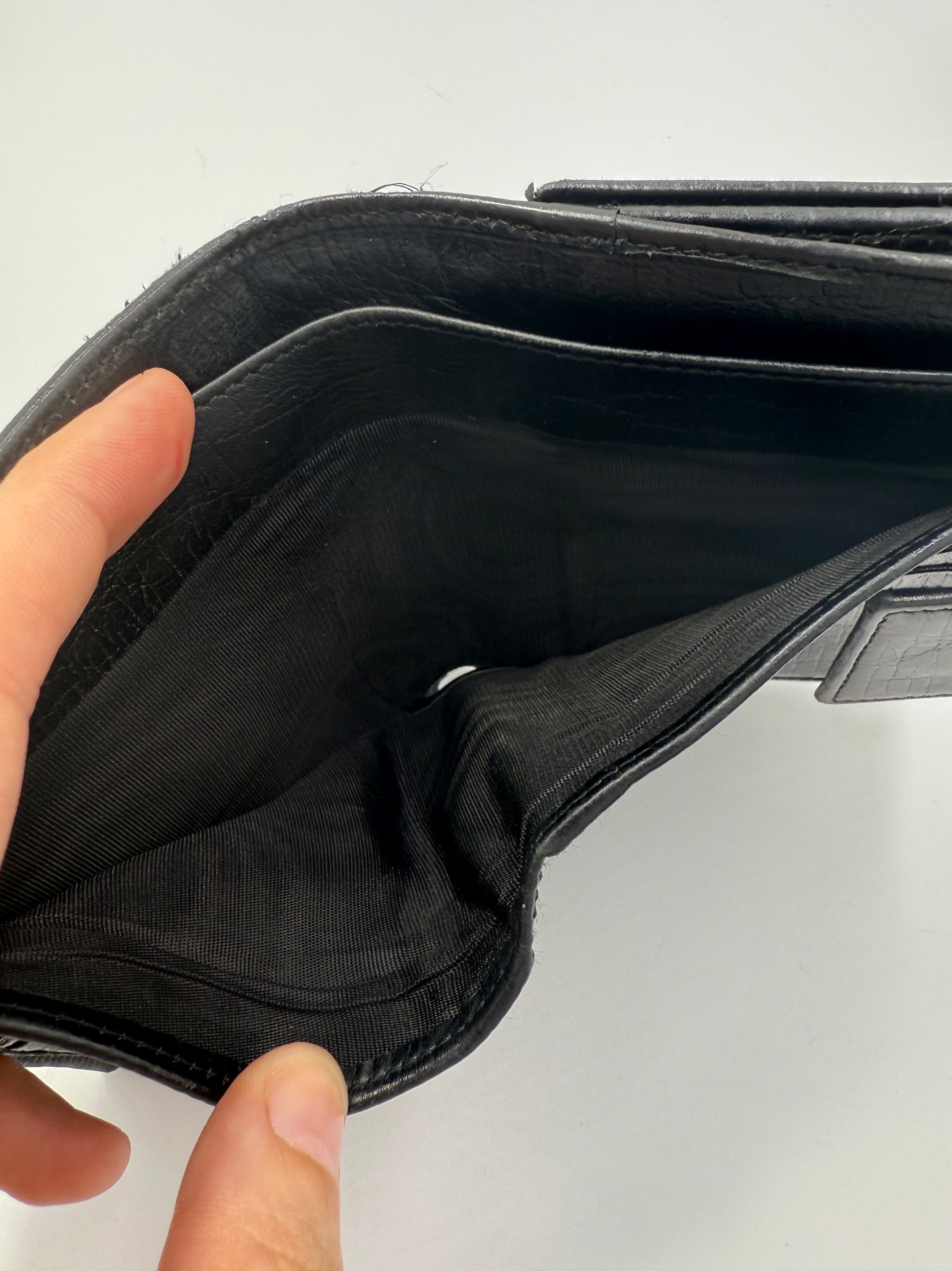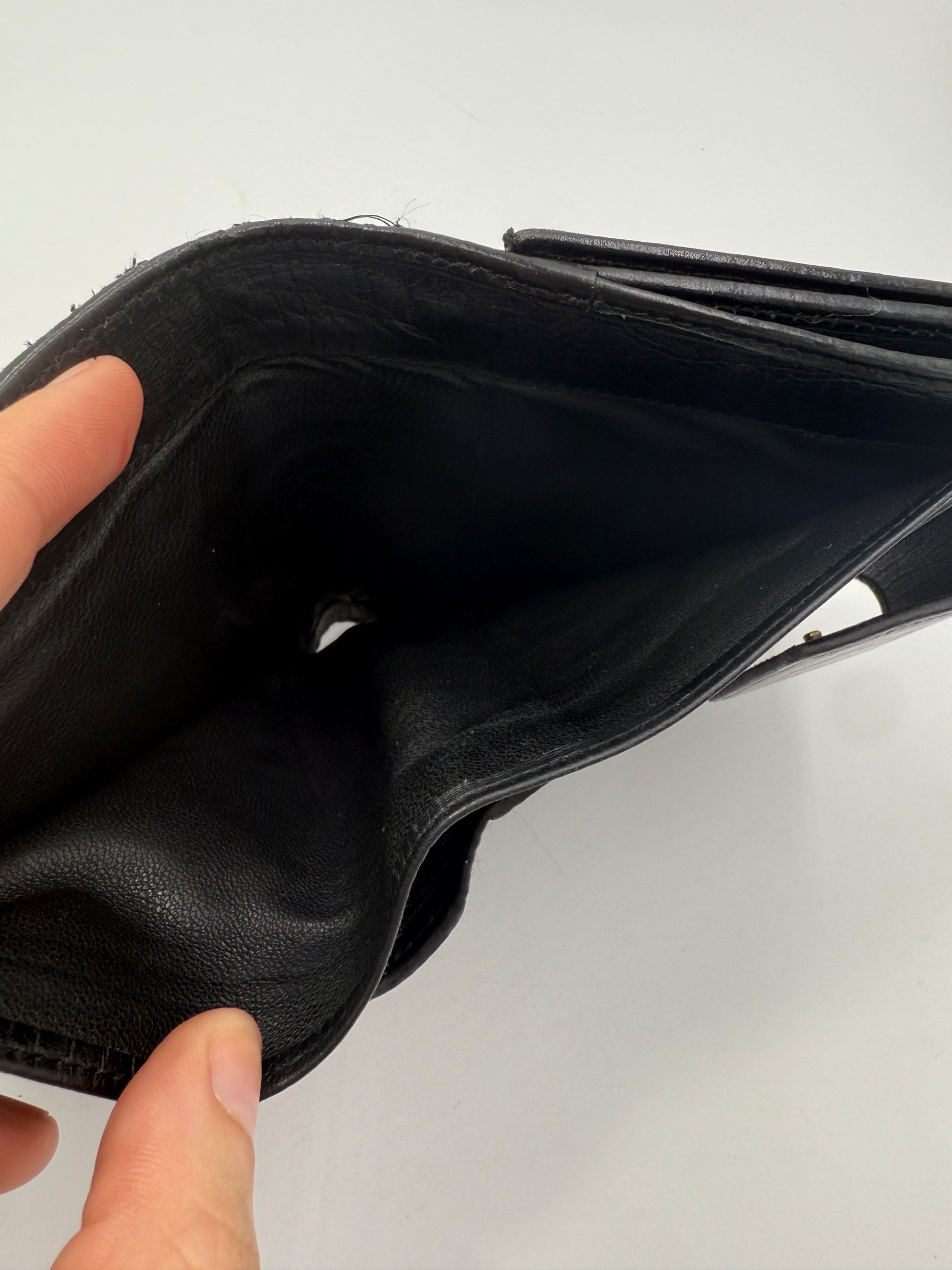 Open the wallet to reveal a well-organized interior: one side features multiple card slots and a dual billfold for cash and receipts, while the other side houses a snap coin compartment, keeping your essentials secure and accessible. All hardware functions smoothly, and the wallet is free from any unpleasant odors—proof of its careful upkeep.