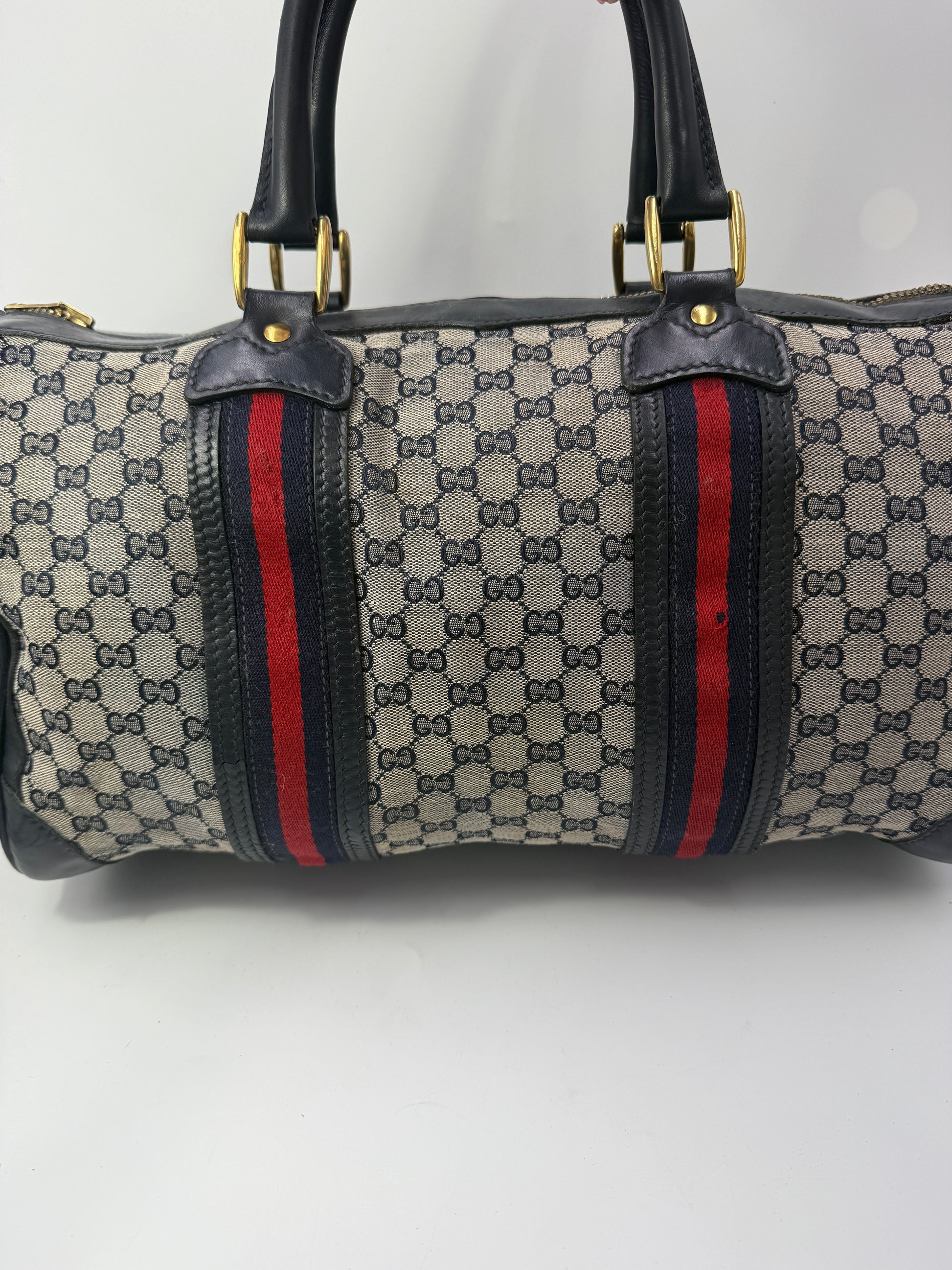 Travel in timeless luxury with this authentic Gucci GG Canvas Boston Travel Bag, a classic piece of vintage Gucci craftsmanship. Designed in the house’s signature GG monogram canvas with rich navy blue leather trim and the iconic red and blue webbing, this bag embodies the elegance and heritage that define Gucci’s legacy.