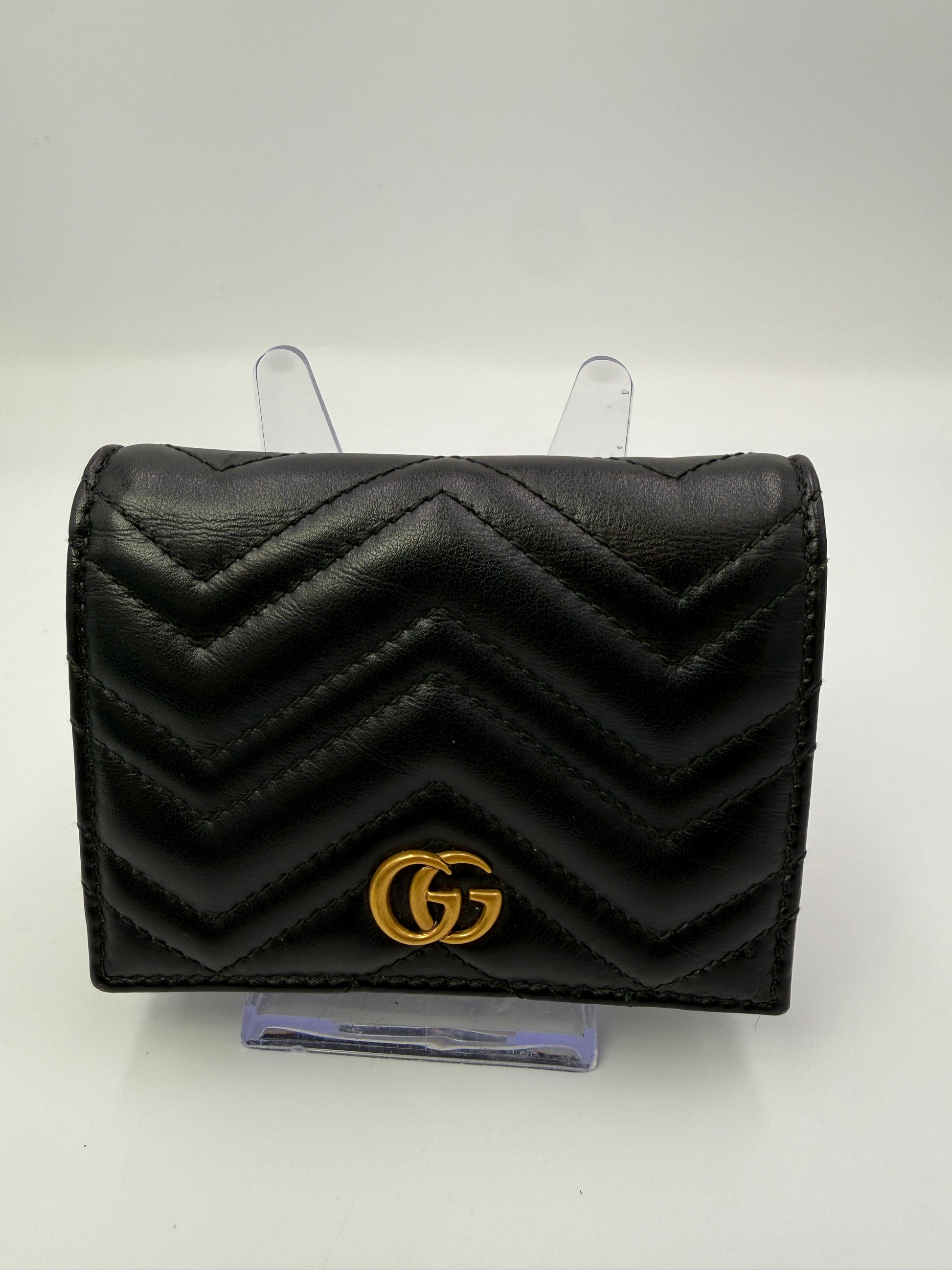 Compact in size yet big on luxury, this Gucci GG Marmont wallet is crafted in smooth black leather with the signature chevron quilting. The front is accented with the iconic GG gold-tone hardware, while the back features an embroidered GG emblem, adding a subtle yet bold touch of Gucci heritage.