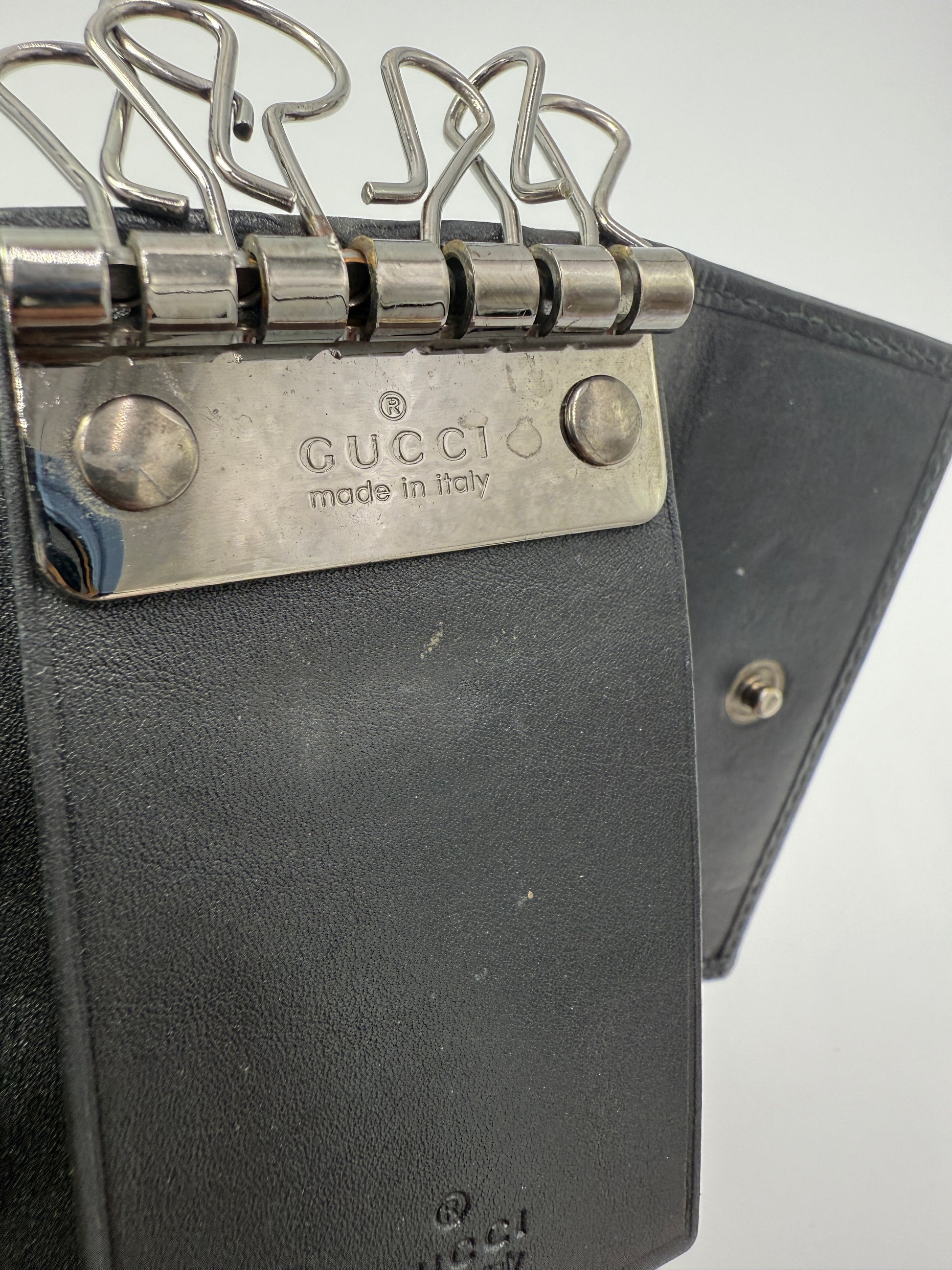Inside, you’ll find six sturdy silver-tone key hooks, all in excellent working condition, ready to keep your keys organized in true Gucci fashion. Designed with versatility in mind, this key holder also includes a side card slot—perfect for slipping in your ID, credit card, or folded cash, making it a sleek grab-and-go option.