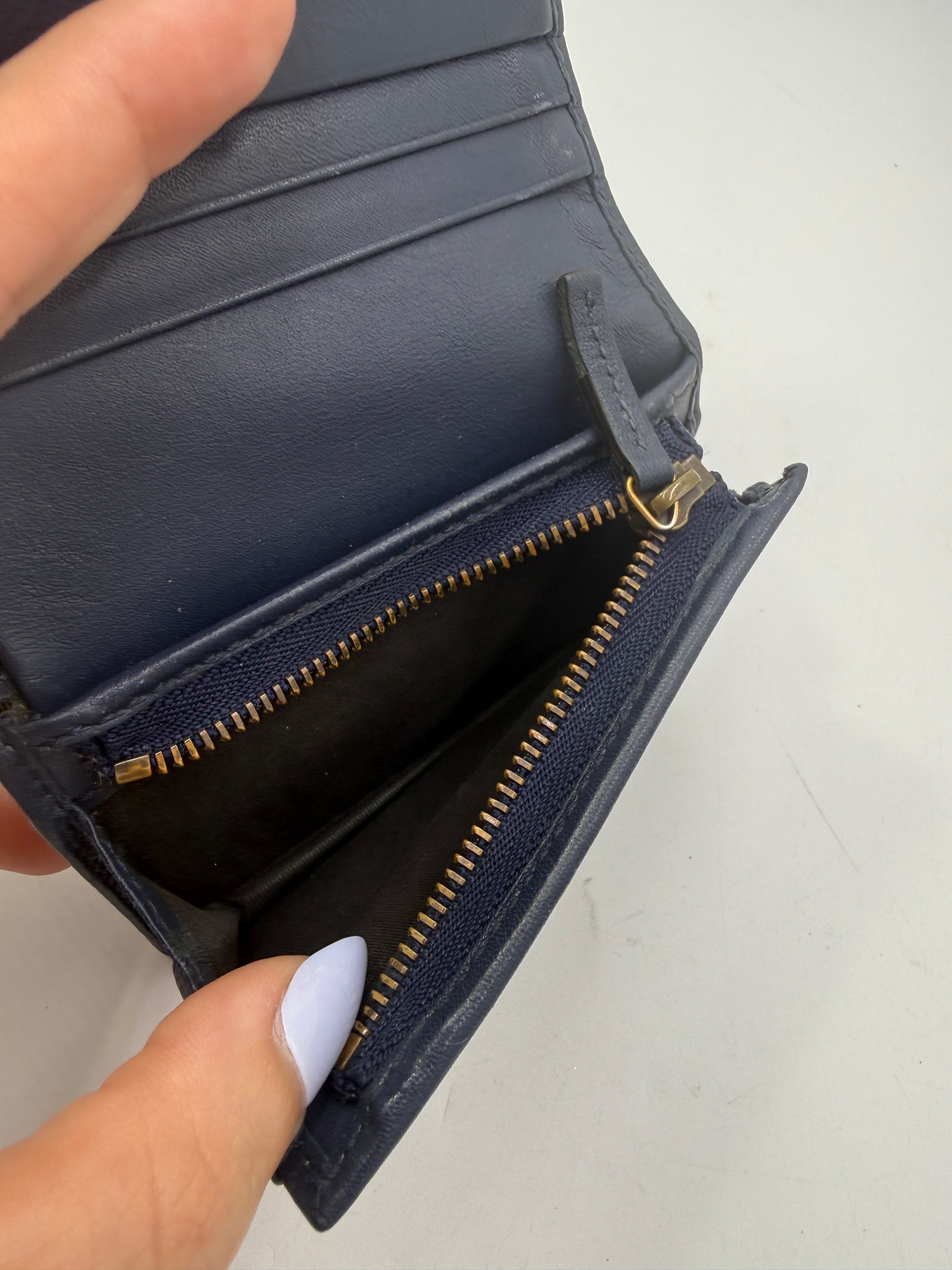 The snap closure opens to reveal a sleek navy leather interior with multiple card slots, a secure coin pocket, and bill compartments, giving you all the function you need in a perfectly compact silhouette. Its size makes it ideal for slipping into smaller bags or carrying on its own when you want understated luxury with a fashion-forward edge.