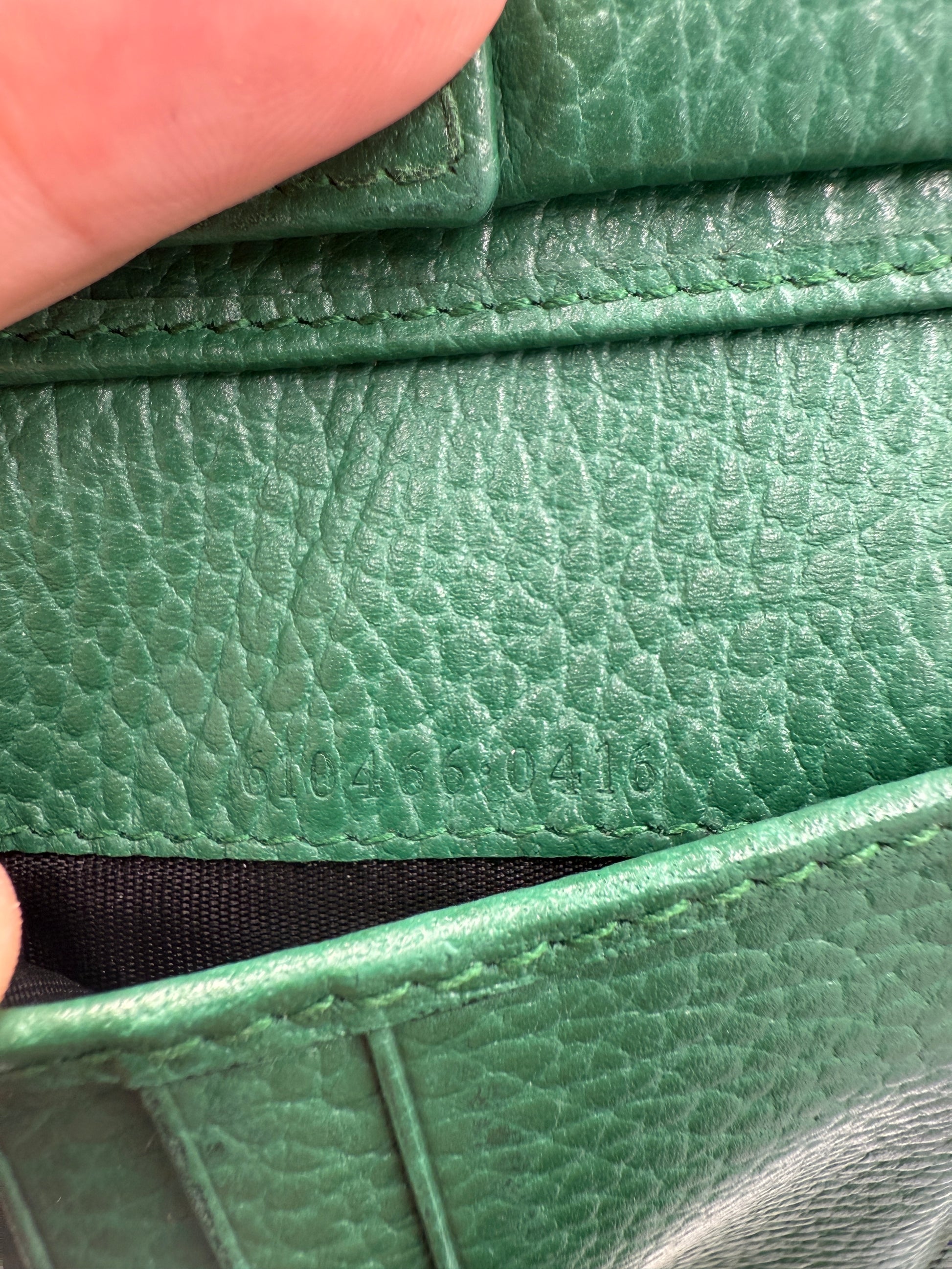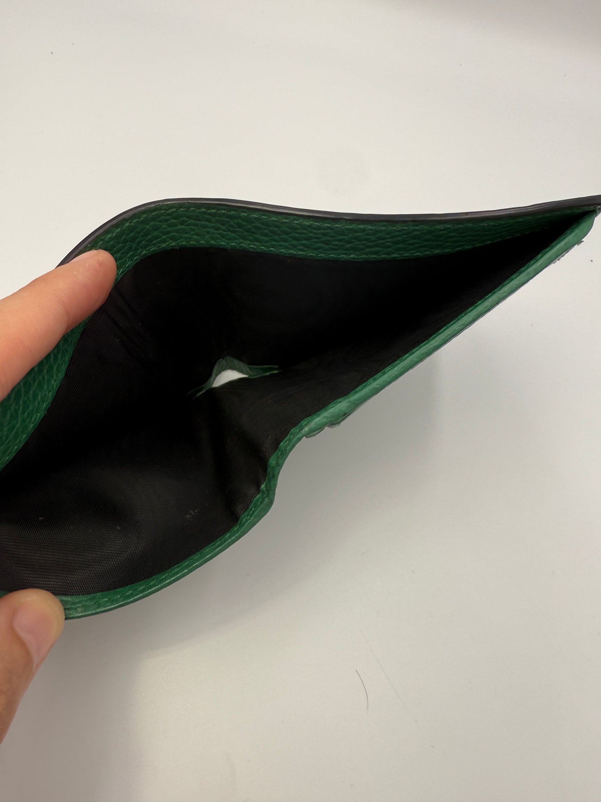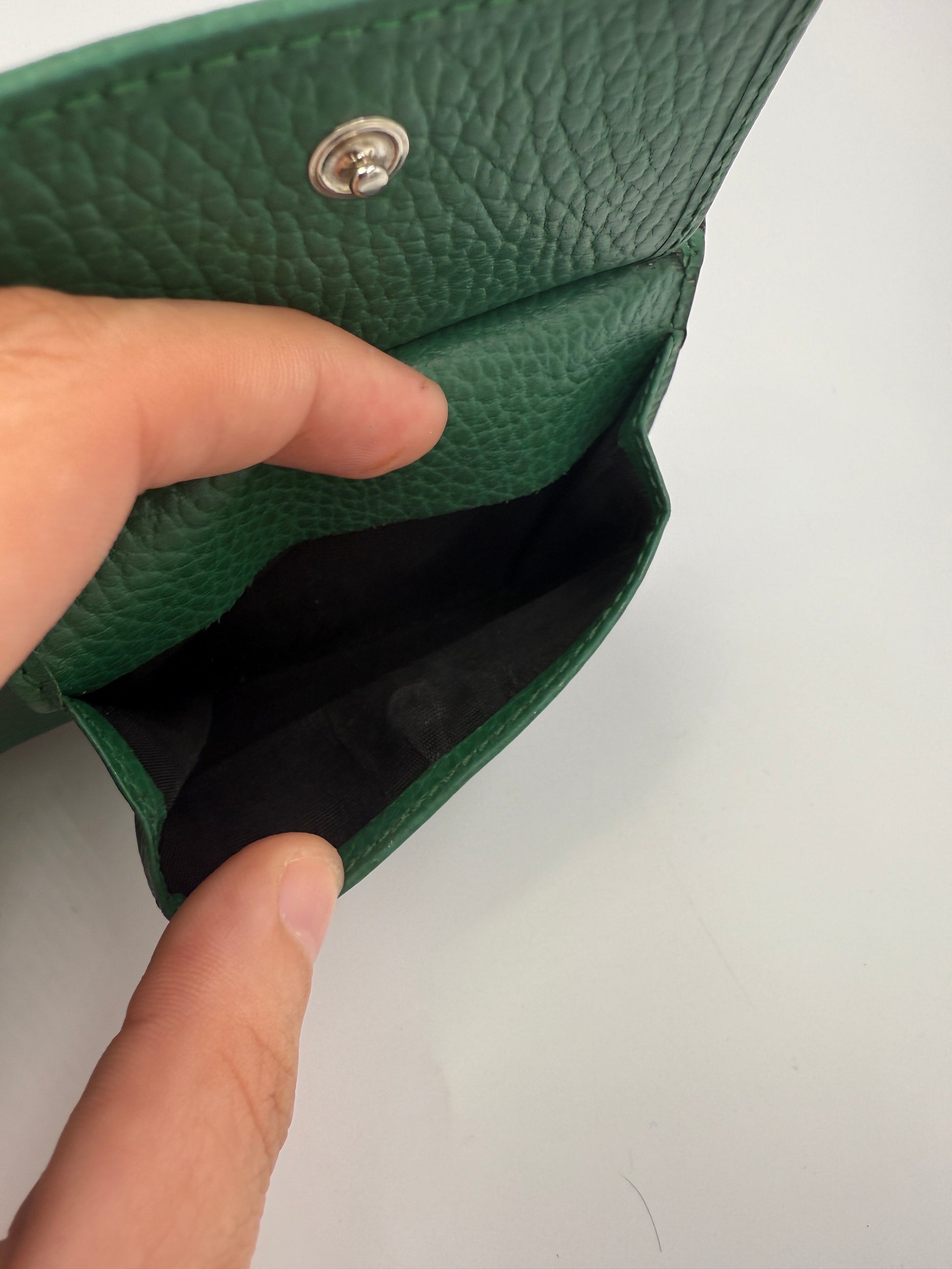 Elevate your everyday essentials with this Gucci GG Pebbled Calf Leather Wallet, a sleek and refined piece that perfectly balances functionality with luxury. The black pebbled calf leather exterior offers a classic, durable finish, while the contrasting green leather interior adds a bold pop of color and unmistakable Gucci style. A minimalist silver GG logo on the front adds just the right touch of iconic branding.