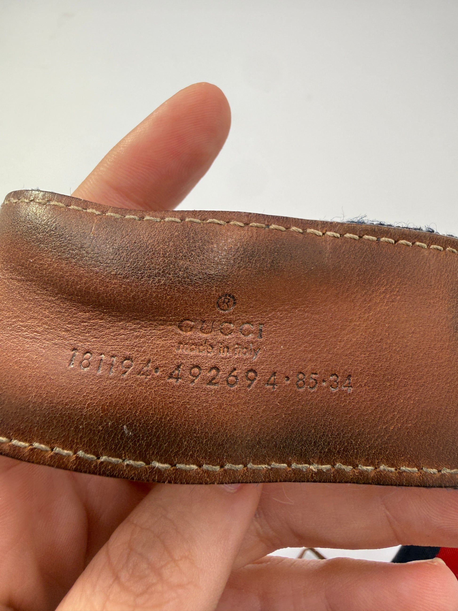 Gucci Ophidia Web Stripe Knight Crest Belt with Navy Blue Leather Trim 85 cm 34 in