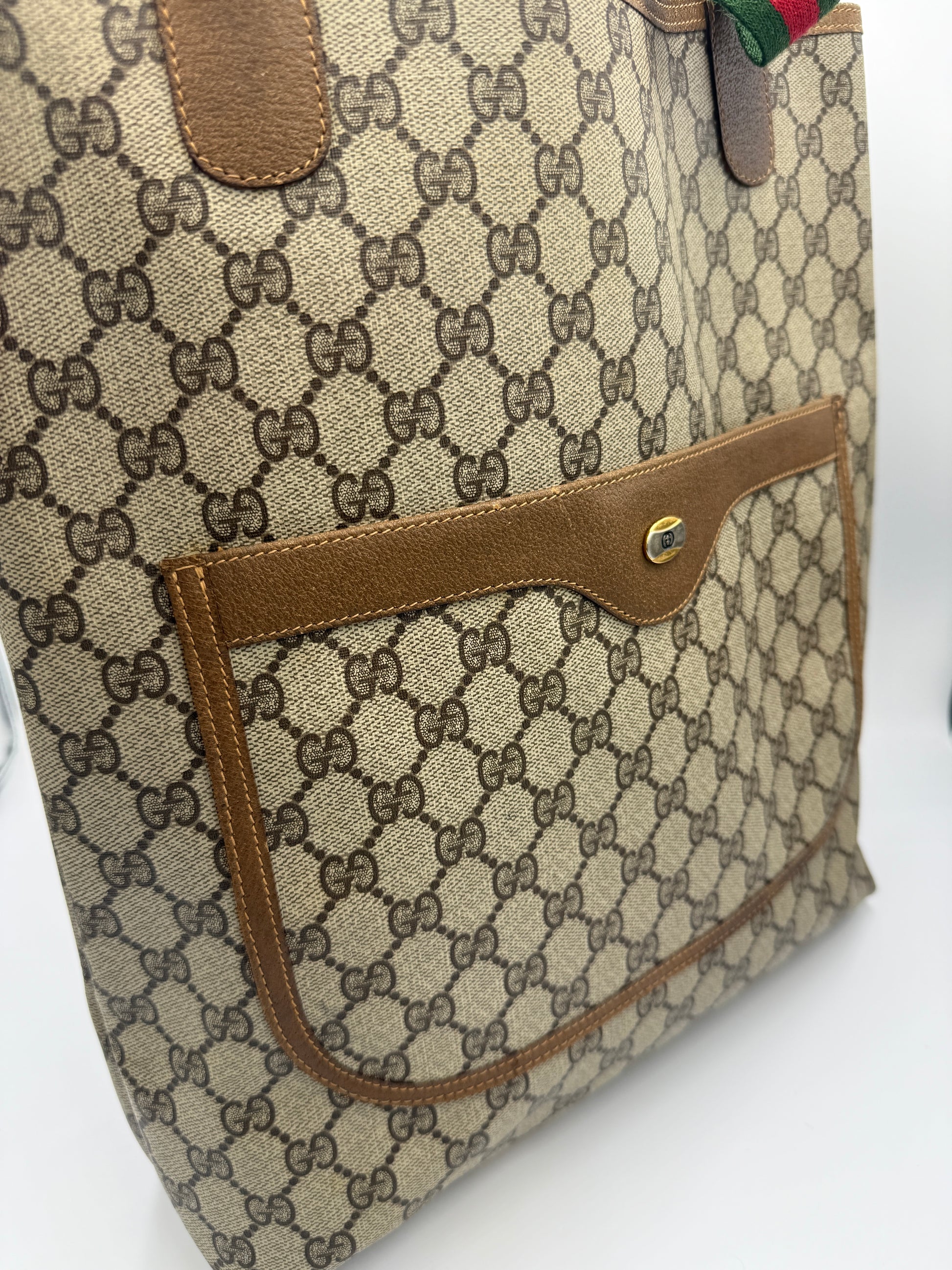 Elevate your collection with this vintage Gucci GG Supreme Canvas Tote, a timeless piece that exudes iconic style and understated luxury. Crafted from Gucci’s signature GG Supreme coated canvas, it features classic Sherry Line web handles, rich brown leather accents, and a striking two-tone gold and silver GG logo plaque on the front.