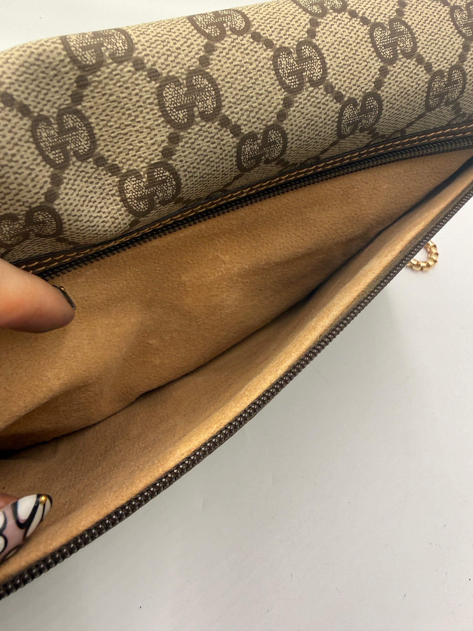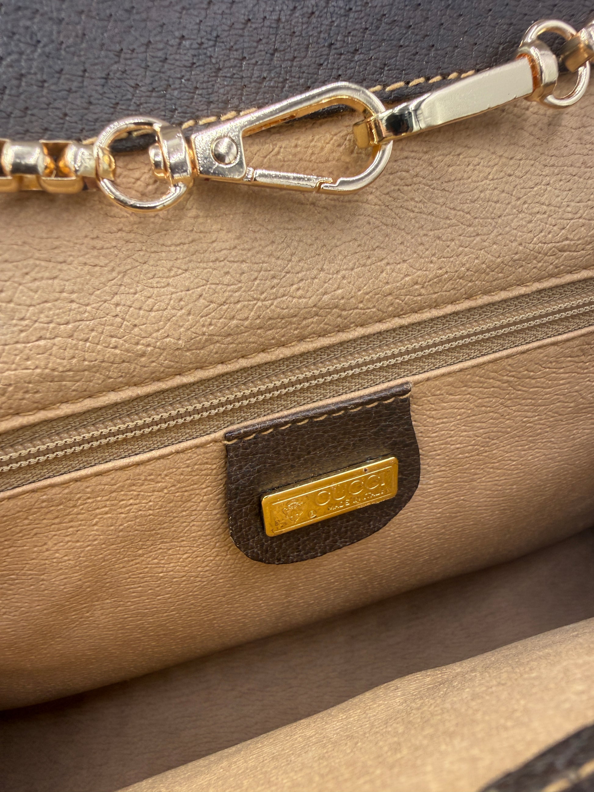 The spacious interior, lined in beige suede-like material, features a secure zip pocket and the unmistakable Gucci Made in Italy gold plaque — a hallmark of the brand’s vintage craftsmanship. The structured silhouette and magnetic flap closure give it a polished look that’s equally chic carried as a clutch or styled with a detachable strap as a slim shoulder bag.