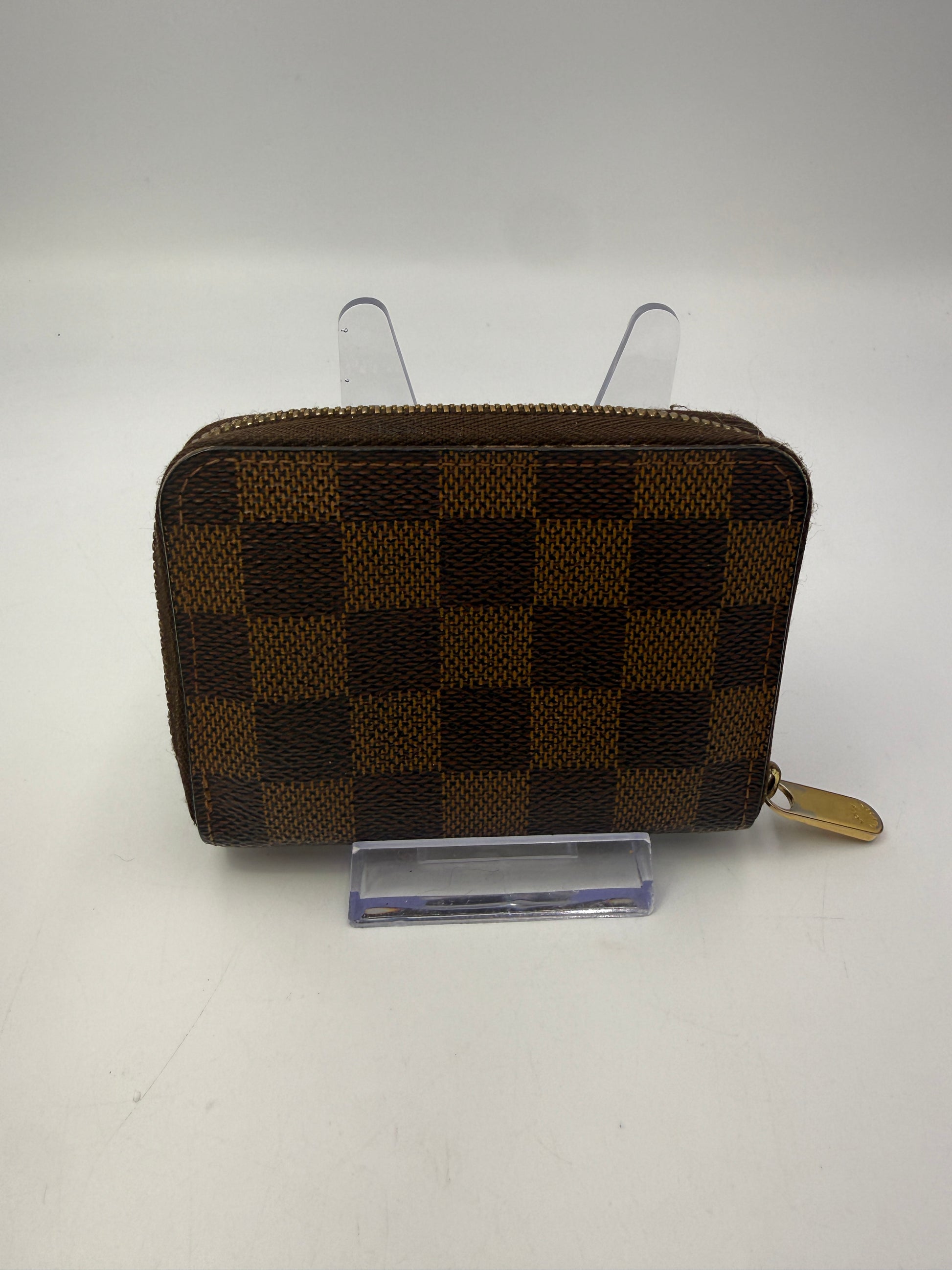 Crafted with durable coated canvas and smooth brown leather trim, it’s secured by a sturdy zip-around closure with the signature gold-tone Louis Vuitton pull tab, ensuring both style and security. Its compact size easily slips into any handbag or can be carried on its own for a polished, minimalist look.