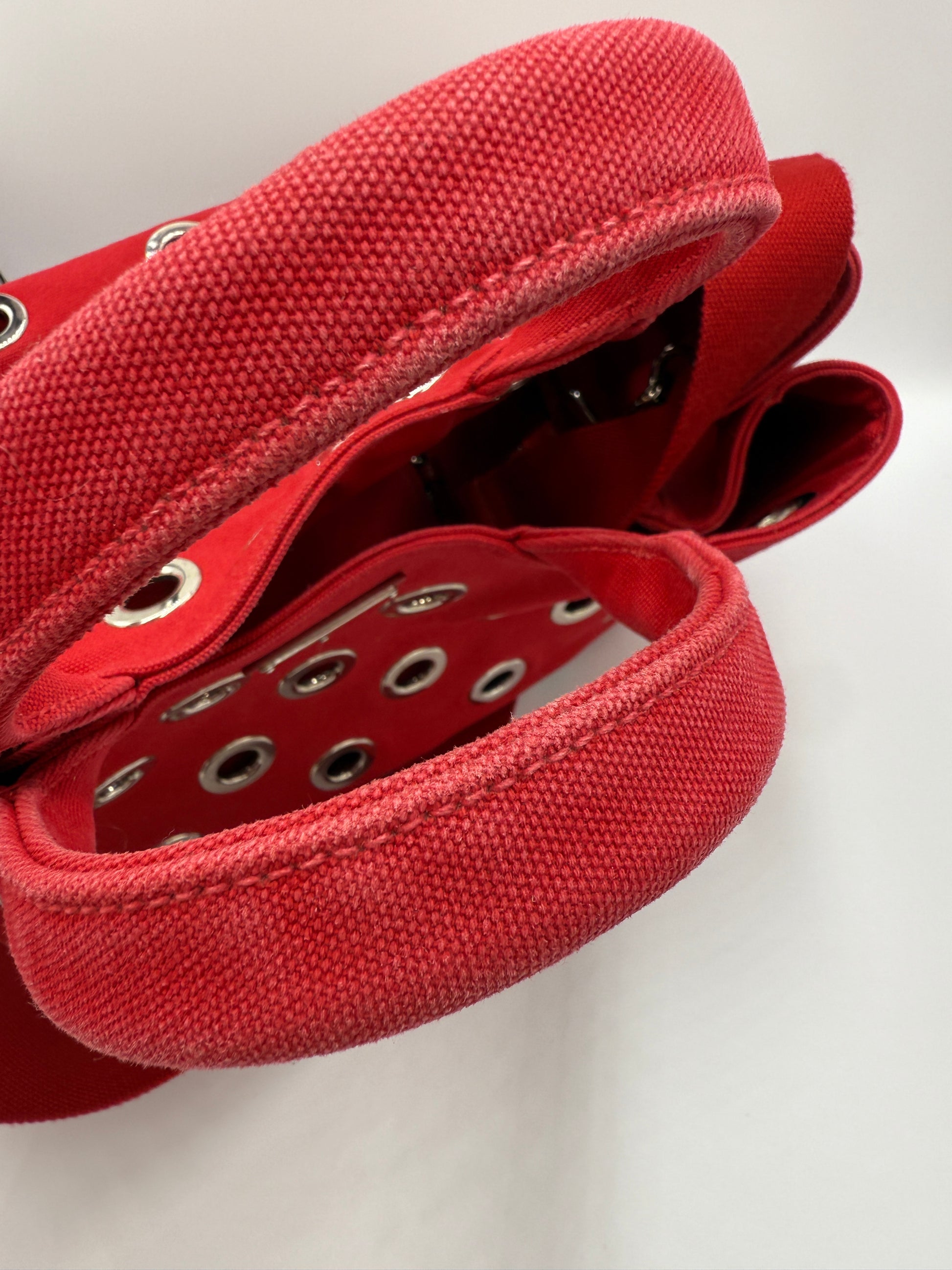 Elevate your collection with this stunning Prada Red Canapa Grommet MM, a bold yet sophisticated handbag that exudes luxury. Crafted from durable canvas and adorned with eye-catching silver-tone grommet detailing, this bag is the perfect blend of edgy elegance.