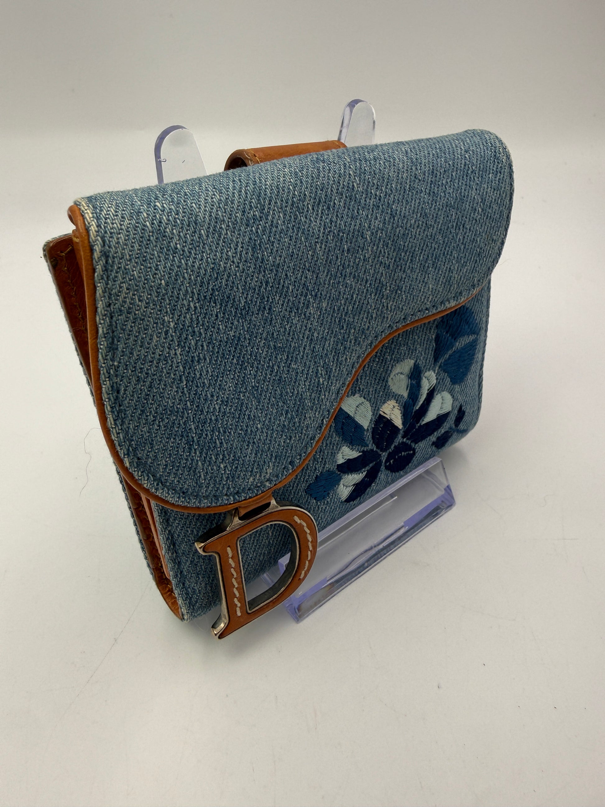 Elevate your everyday essentials with this chic Dior Denim Compact Wallet. Crafted from soft blue denim and beautifully accented with embroidered floral detailing in shades of blue, this piece perfectly blends casual charm with timeless luxury. The signature Dior “D” charm in leather-trimmed metal adds an iconic touch, making it instantly recognizable.