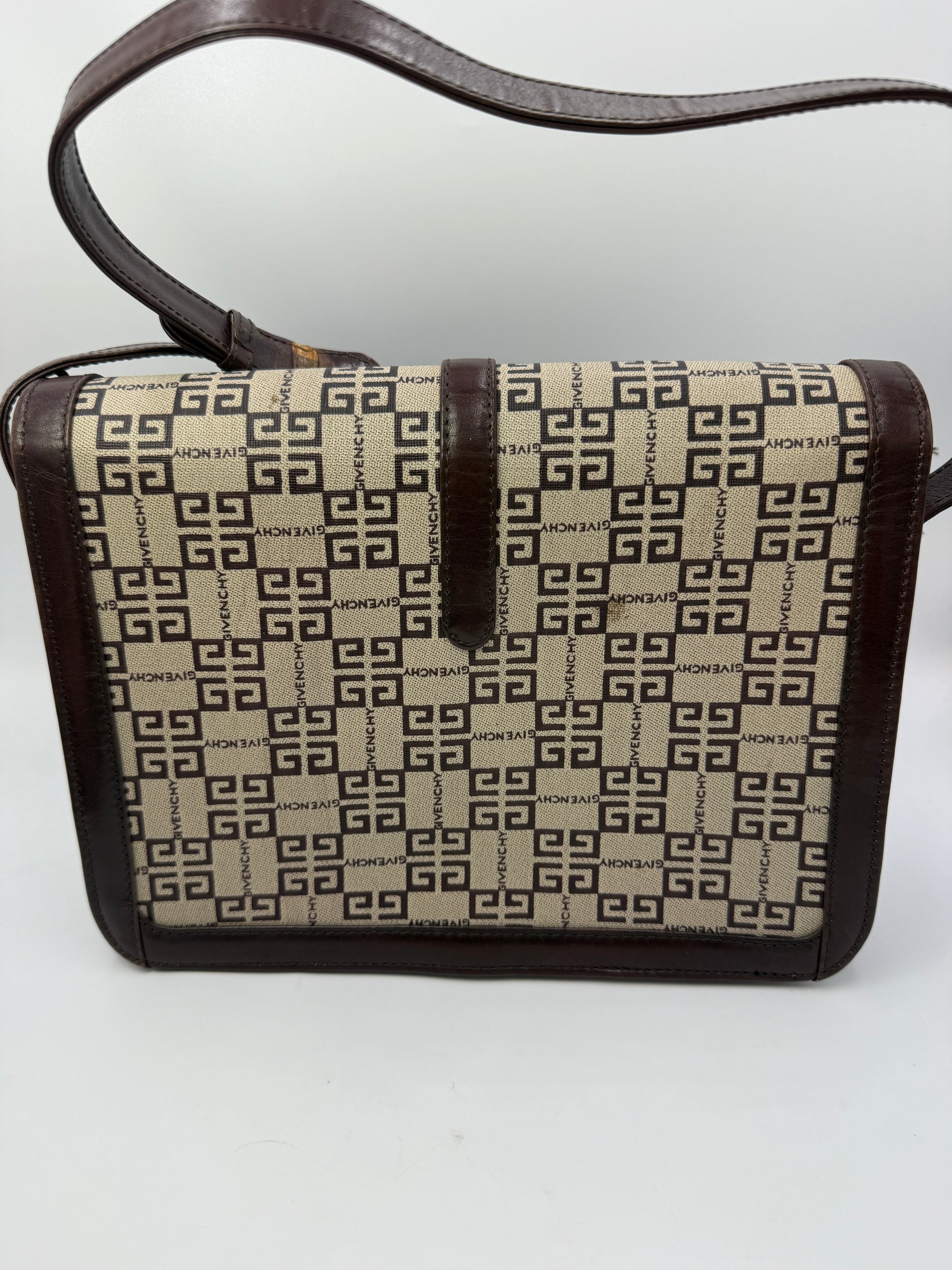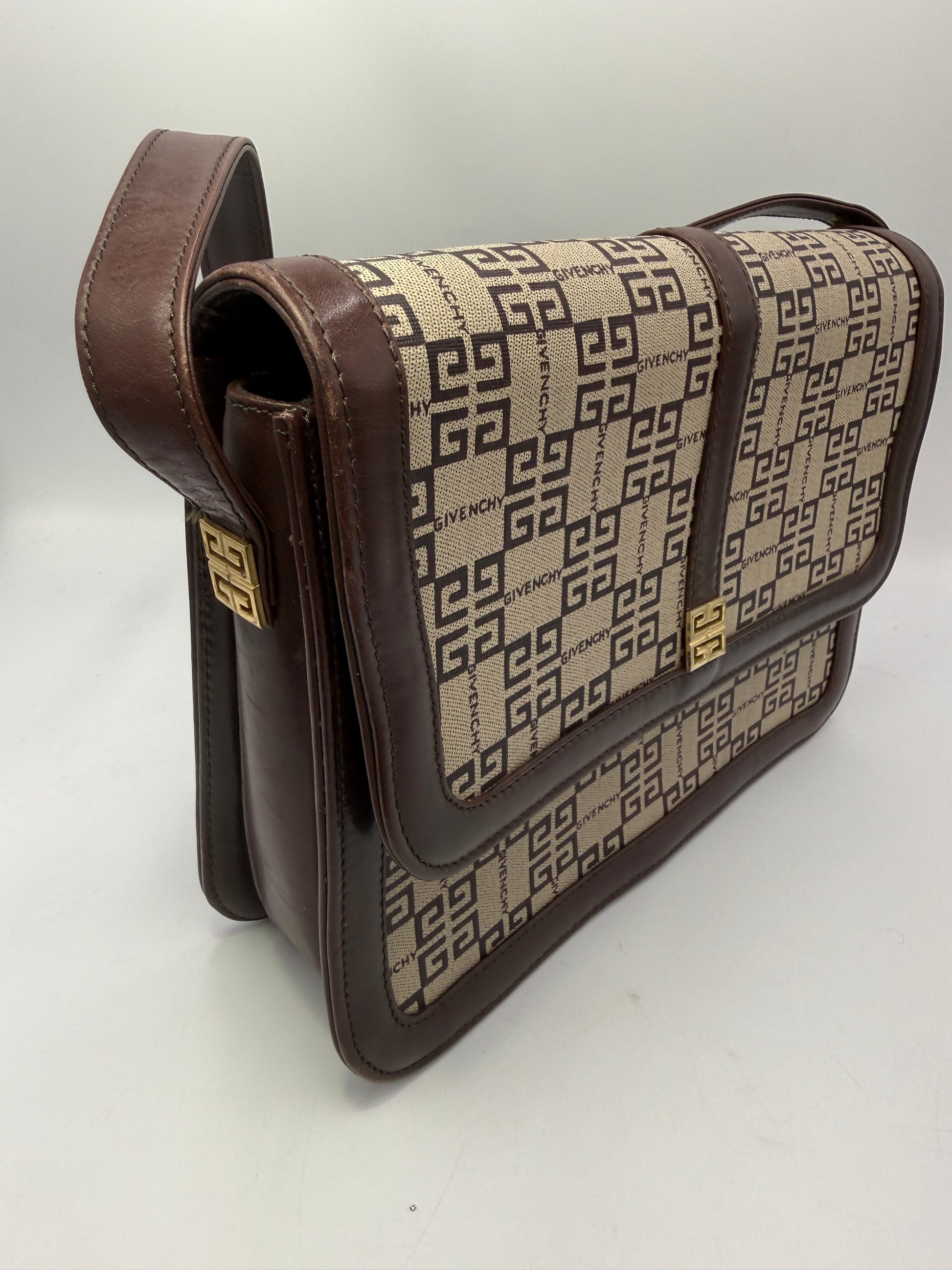 Step into timeless sophistication with this vintage Givenchy shoulder bag, crafted in signature 3G monogram coated canvas and finished with smooth brown leather trim. A striking gold-tone Givenchy logo clasp adorns the front flap, with additional Givenchy logo hardware on the sides for a truly luxurious touch.