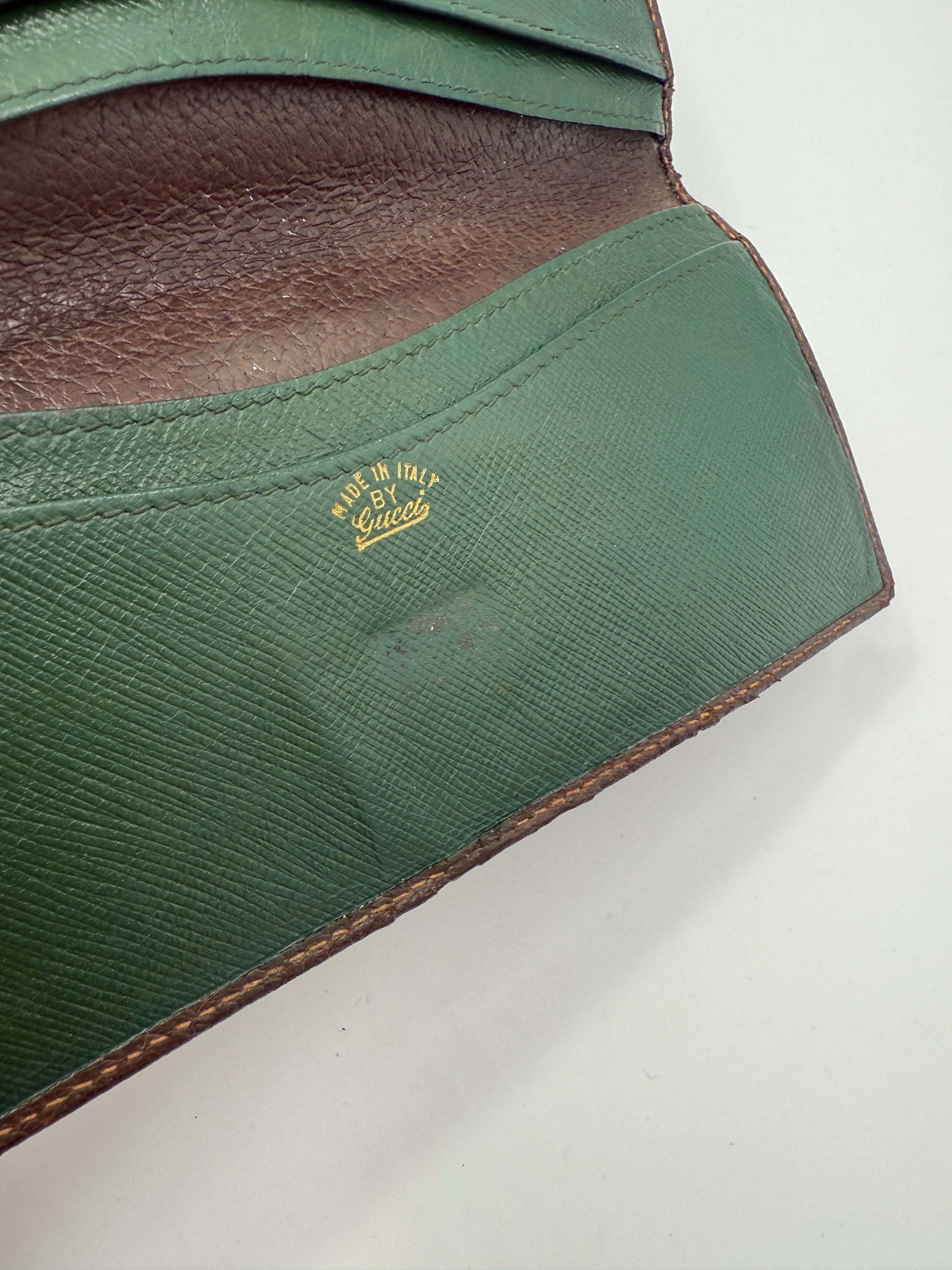Accented with gold-tone hardware, which shows subtle silvering from age, this wallet carries the unmistakable patina of a well-loved, high-end piece—a detail that only adds to its authenticity and vintage appeal.